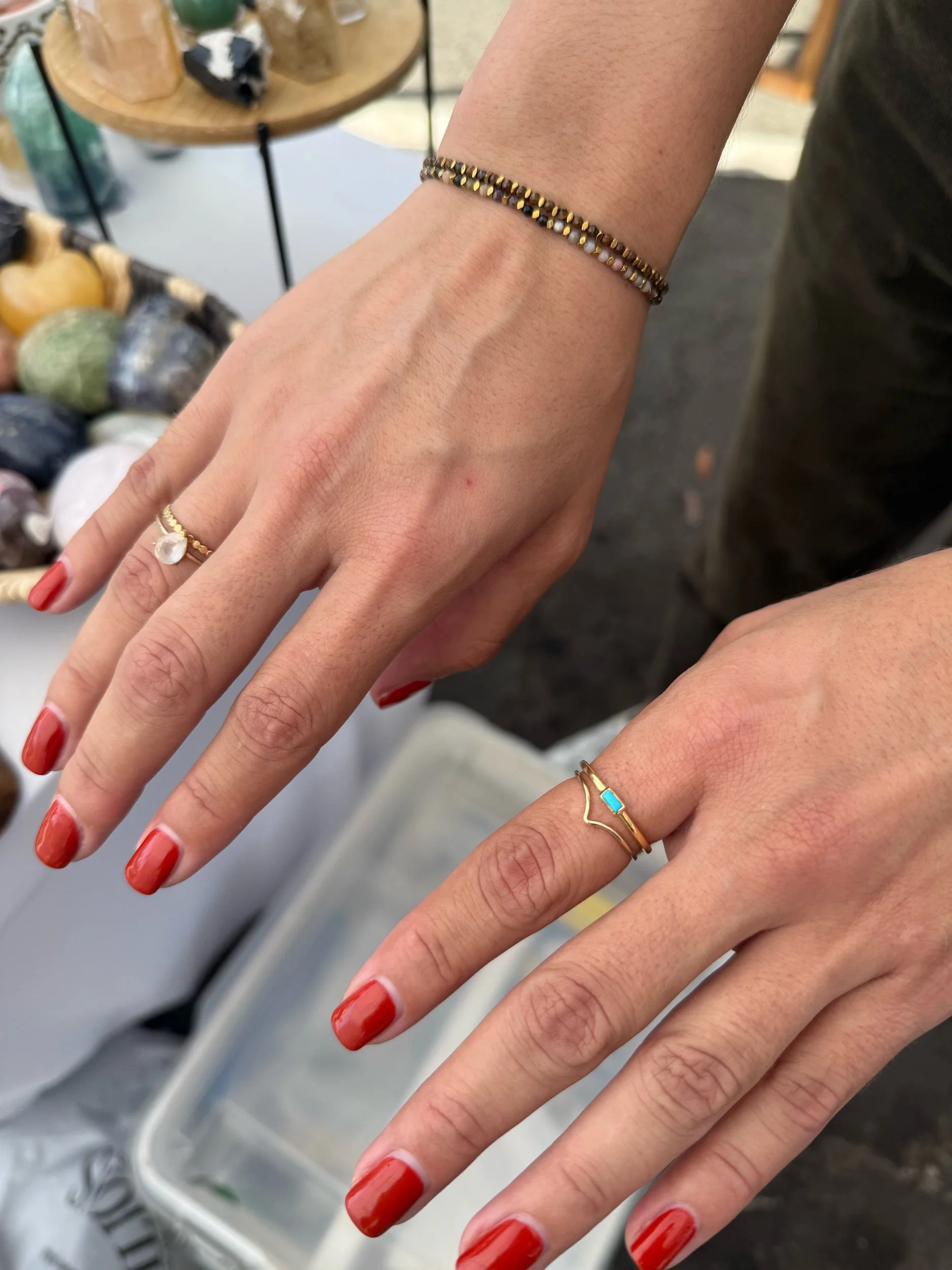 Etched silver band, slightly adjustable up or down. You can pull apart or pinch together. Both have Agate geodes. One has rough green Tourmaline and the other has a Lemurian Quartz.