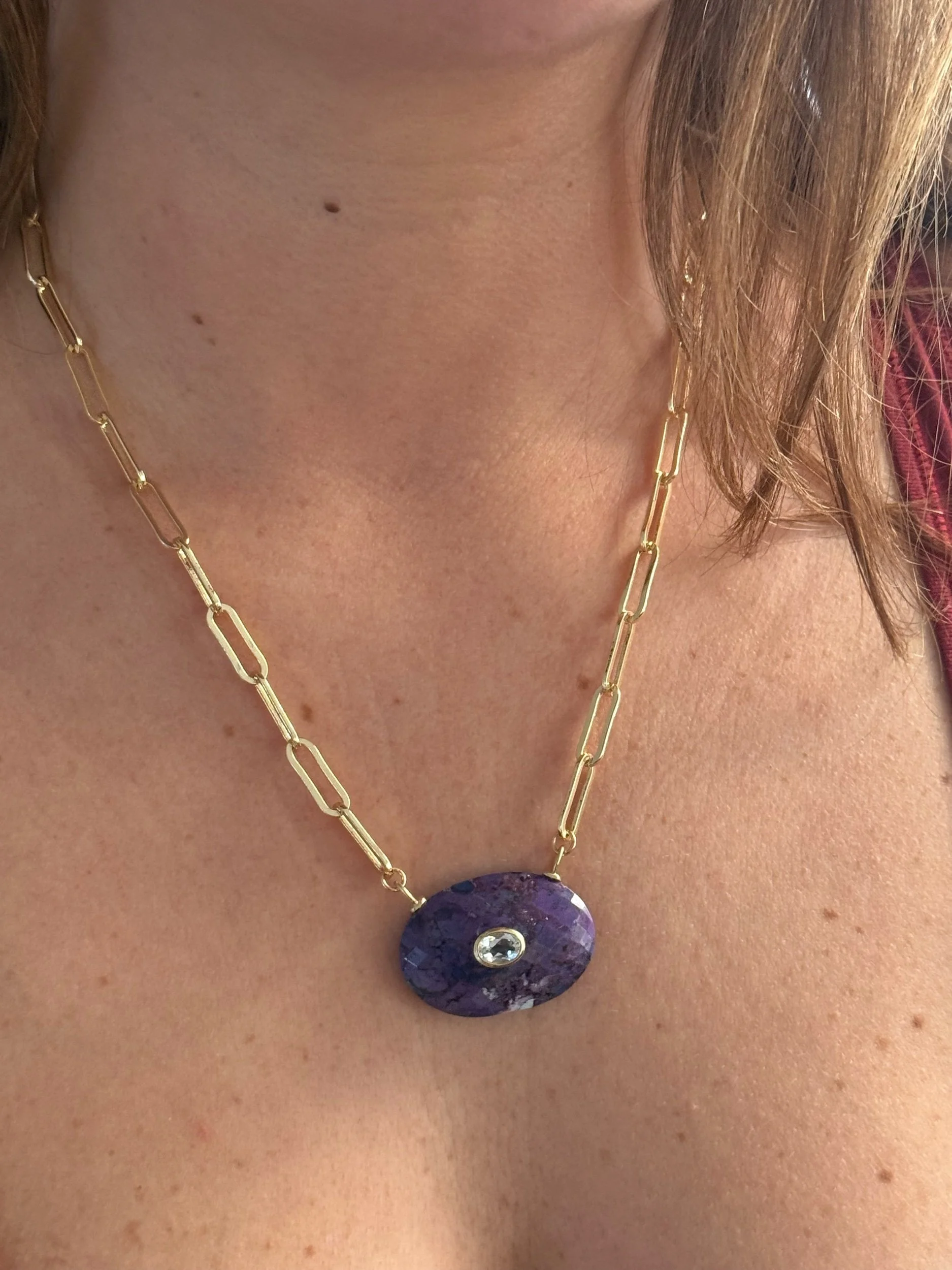Amazonite beaded necklace measures 15 inches with 2 inch extension. Gold sun with cubic zirconia charm. Sun measures 18mm. Clasp and extension chain are gold filled.