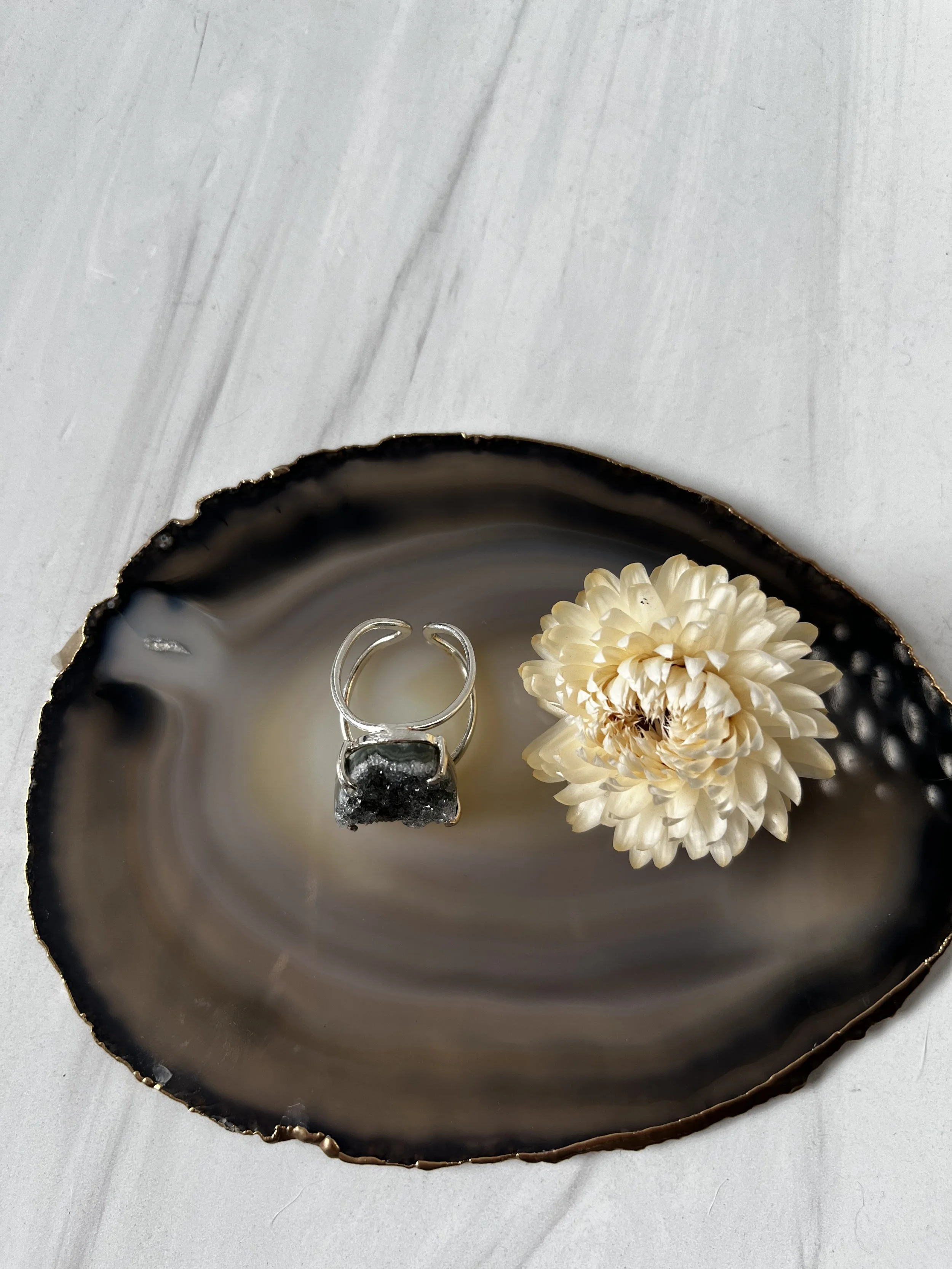 Shop › Black Amethyst druzy silver ring Image 1 of 3 Image 2 of 3 Image 3 of 3 Black Amethyst druzy silver ring $35.00 Black Amethyst druzy silver adjustable ring. Stone measures 24×18mm. Add To Cart Added! Black Amethyst druzy silver adjustable ring. Stone measures 24×18mm. Reviews Reviewer Name Review Date Star Rating Description Posted on Etsy Product Show More You Might Also Like Rutilated Quartz silver adjustable ring $50.00 Gold filled circle ring $28.00 Amethyst druzy adjustable ring $40.00 Chevron ring with cz accent gold filled ring from $0.00 Sale Amethyst moon statement ring $35.00