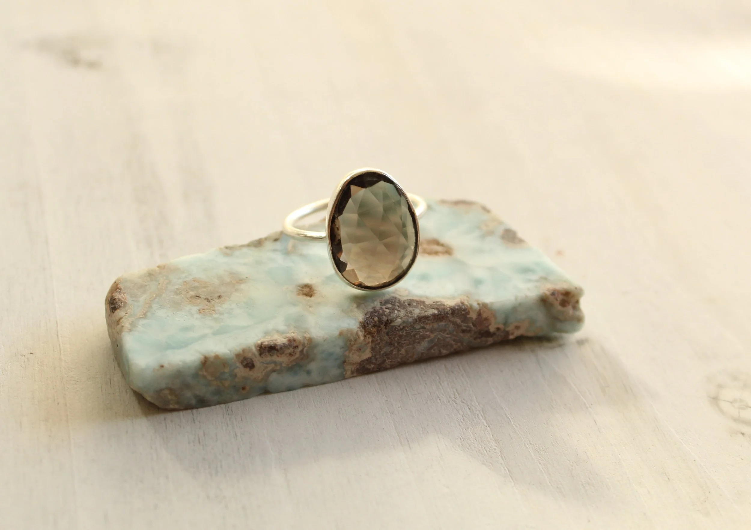 Gold Vermeil with sterling silver as base metal. Oval faceted Labradorite with tear drop faceted Moonstone and square faceted Amazonite sitting along side. Size 6 but can be slightly adjusted (the stones will be farther apart.) Both Labradorite and Moonstone have good flash.